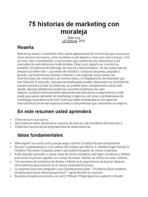 A todo el mundo le gustan las buenas historias, pero las historias no se leen solo por puro disfrute, desde siempre han sido una herramienta muy útil para enseñar y aprender. Este libro es la alternativa al clásico manual de marketing: constituye un compendio de historias entretenidas sobre grandes marcas como Playboy, IKEA, Dove, Martini, Google, Disney, Nike, 3M y otras muchas, que concluyen con una moraleja que invita a la reflexión.