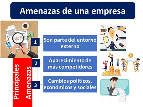 Consideramos amenazas todos aquellos elementos de origen externo que son negativos para el buen funcionamiento de la empresa. Deberás tener en cuenta las mismas cuestiones que en las oportunidades, pero aquí se indican las condiciones que te perjudican.