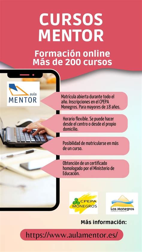 Aula Mentor es una iniciativa de formación abierta, flexible y a través de Internet, dirigida a personas adultas que deseen ampliar sus competencias personales y profesionales. La iniciativa está promovida por el Ministerio de Educación, Formación Profesional y Deportes en colaboración con la Concejalía de Formación, Emprendimiento y Desarrollo Económico del Ayuntamiento de Almendralejo.