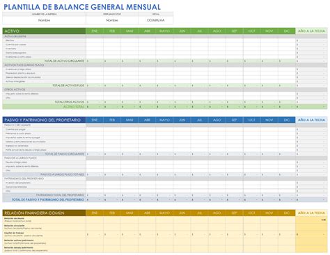 - Estructura del Balance: La plantilla debe incluir dos partes principales: activos y pasivos. Los activos se dividen en activos corrientes (como caja y cuentas por cobrar) y activos no corrientes (como inmuebles y maquinaria).