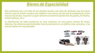 Estos son productos con características únicas que los consumidores están dispuestos a buscar y comprar, sin importar el precio o la conveniencia. La marca y la lealtad al producto son importantes. Ejemplos incluyen: automóviles de lujo, joyas exclusivas, obras de arte, etc. Las estrategias de marketing se centran en la creación de una imagen de marca exclusiva y en la distribución selectiva.