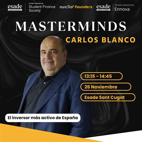 Carlos Blanco Vázquez (Barcelona, 1968) es un reconocido emprendedor e inversor privado en el sector de las nuevas tecnologías. Su trayectoria lo ha posicionado como uno de los principales referentes del ecosistema emprendedor español. Ganador del premio Mejor Emprendedor de España 2014 por los X Premios Pyme por Expansión e Ifema, y Mejor Business Angel 2014 por los premios AEBAN, Carlos Blanco ha demostrado su capacidad para identificar y apoyar proyectos innovadores.