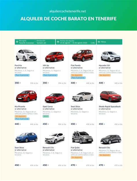 - Tipo de Coche: Como te comentábamos, la mayoría de carreteras de Tenerife están en buen estado así que en nuestra opinión, el coche más básico y pequeño (el más barato), suele ser más que suficiente. En cualquier caso, en función de las preferencias (si sois 5 personas o incluso más, o si preferís un coche más alto o con más potencia) la mayoría de las compañías tienen coches para todos los gustos.