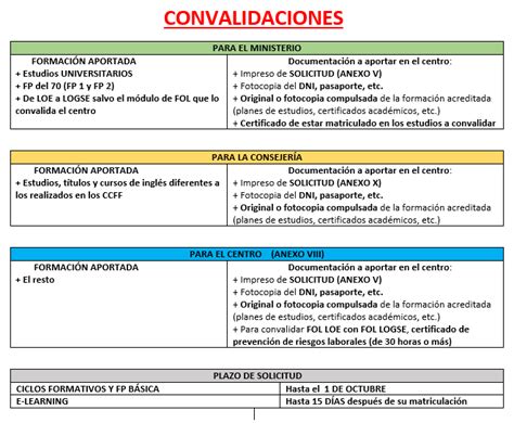 - Si se desean convalidar módulos aportando universitarios, el solicitante debe incluir los programas de las asignaturas cursadas y superadas que el alumno considere que dan lugar a la convalidación del módulo o módulos solicitados. Estos programas deben ir sellados por la Universidad. En cada programa debe constar el mismo curso académico que figura en el certificado como superado. Si no fuera así, se debe adjuntar un escrito de la universidad confirmando que los programas son los que se impartieron el curso que se superaron. No se considerarán los programas de asignaturas convalidadas, reconocidas, adaptadas o superadas por compensación.