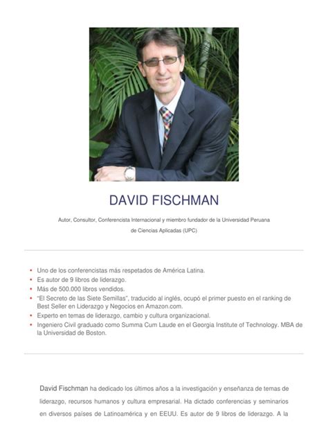David Fischman es un reconocido experto en temas de liderazgo, desarrollo personal y gestión empresarial. A través de sus libros, Fischman comparte principios y estrategias esenciales para alcanzar el éxito tanto en el ámbito personal como profesional. Sus obras se caracterizan por ofrecer herramientas prácticas y motivadoras para transformar creencias limitantes y perseguir los sueños con valentía.