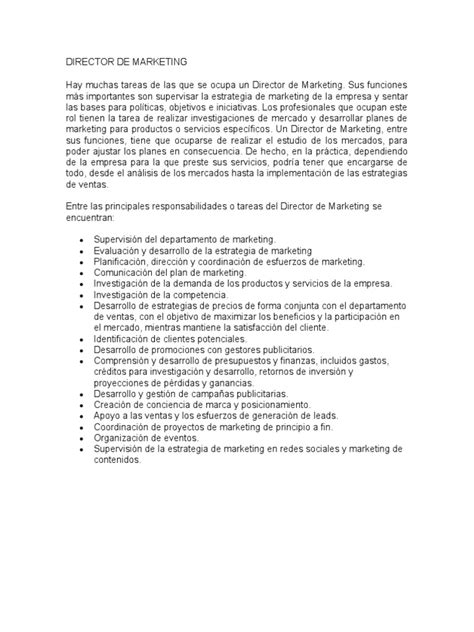 - Pensamiento Estratégico: Una de las principales responsabilidades del director de marketing es la creación de una estrategia de marketing eficaz.