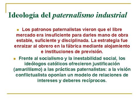 El paternalismo industrial aparece por conveniencias meramente pragmáticas; la clave era evitar cualquier atisbo de autoorganización obrera y mantener la dominación fuera de la fábrica a través de actuaciones -viviendas, comedores, seguros sociales, etc.-, aparentemente de tinte humanitario, nacidas del deber social de las clases poderosas hacia las más desfavorecidas. Con la irrupción del socialismo, este paternalismo industrial sufrió un importante deterioro que le llevó a una ideologización más acusada, defendida sobre todo por los pensadores católicos belgas y franceses, de marcada influencia en los católicos sociales españoles, y cuyo sustento ideológico fueron las encíclicas Rerum Novarum (1891) de León XIII y Quadragesimo Anno (1931) de Pío XI.
