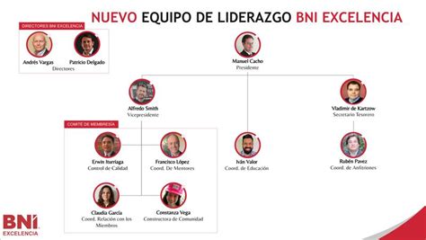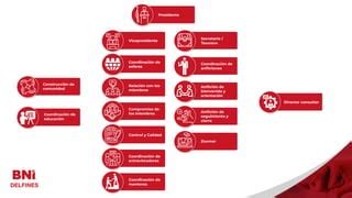 Dentro de un grupo BNI Dinamiza, existen diversos roles de liderazgo que contribuyen al funcionamiento y éxito del capítulo. A continuación, se presenta una estructura general de estos roles: