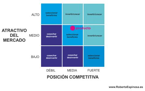 En el eje de «posición competitiva» debemos valorar la capacidad de nuestro producto para competir contra otras opciones existentes en el mercado y clasificarlo en uno de sus tres cuadrantes: débil, media o fuerte. Por otra parte, en el eje de «atractivo del mercado» como bien indica su nombre, analizaremos el atractivo de mercado en el que opera el producto, para posteriormente también clasificar el resultado en uno de sus tres cuadrantes: bajo, medio o alto. Tal y como podemos observar en la imagen de la matriz existen tres áreas que corresponden a tres estrategias de marketing de cartera: