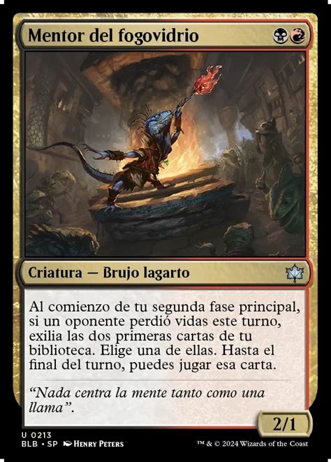 El Mentor del fogovidrio es una carta de criatura - brujo lagarto, diseñada por Henry Peters y lanzada por primera vez en julio de 2024 en la edición Bloomburrow.