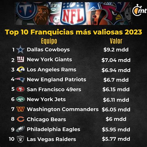 Aquí hay una lista de las 10 franquicias más valiosas de la NFL, según las estimaciones más recientes: