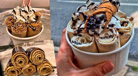 - Volcano: Crepe caliente sobre la que se mezclan toppings y se enrolla creando una forma de volcán.