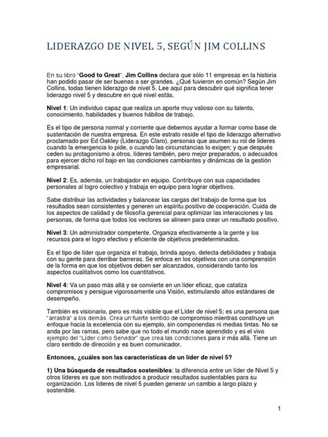 El concepto de Líder de Nivel 5 fue introducido por Jim Collins para describir a los líderes que poseen una combinación única de humildad personal y determinación profesional. Estos líderes no solo buscan el éxito para ellos mismos, sino también para sus equipos y organizaciones. Según Collins, un Líder de Nivel 5 combina lo mejor de dos mundos: la humildad (no buscan el protagonismo personal, y en cambio, enfocan su éxito en el éxito del equipo) y la ambición (son ferozmente decididos a hacer lo que sea necesario para que la organización triunfe).