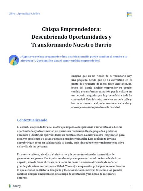 - Actividades prácticas que guían a los estudiantes a generar ideas, analizar su viabilidad y estructurar un proyecto sencillo.