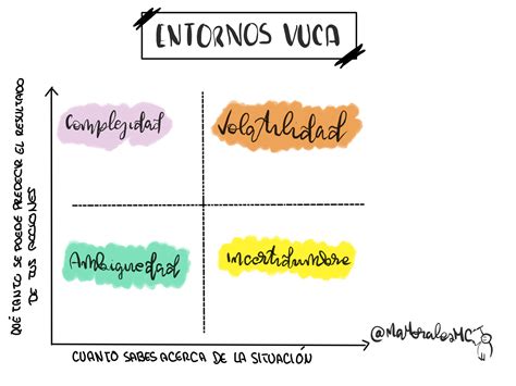 - Complejidad: La esquina superior izquierda da lugar a la complejidad dentro del marco de los entornos VUCA, en la que existe un bajo nivel de conocimiento pero con un alto nivel de predictibilidad.
