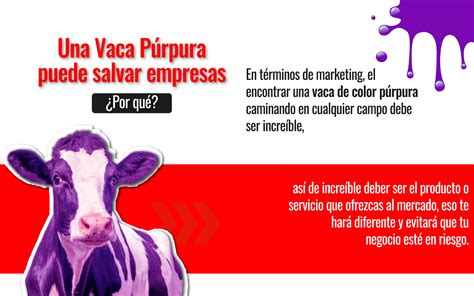Entonces, ¿qué es una vaca púrpura? Una vaca púrpura es todo lo que se destaca de la multitud. “conduciendo por un camino rural, con cientos de vacas, esparcidas por los campos. Mientras conduces, notas una vaca. Una vaca destacando del resto, por una razón. Tiene manchas púrpuras. ¿No te llamaría la atención? ”.
