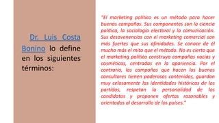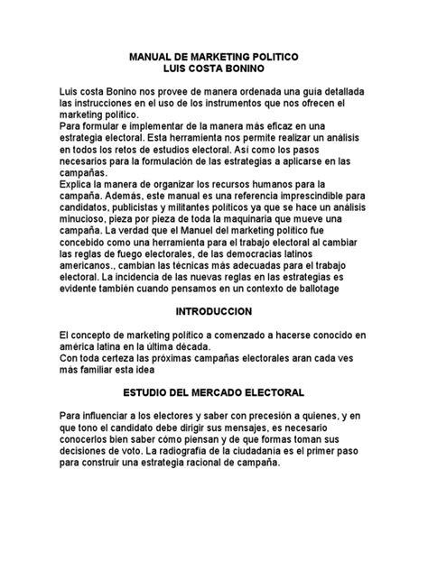 Este artículo ofrece un resumen detallado del manual de marketing político de Luis Costa Bonino, una guía imprescindible para candidatos, publicistas y militantes políticos. El objetivo principal es proporcionar una visión global del "ciclo productivo" de una campaña electoral, desde el conocimiento del electorado hasta la implementación de estrategias de comunicación efectivas. Este manual es especialmente relevante para el contexto latinoamericano.
