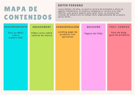 Este es un ejemplo de mapa de contenidos realizado para un buyer persona concreto. Como ves, es muy fácil de rellenar y se ve de forma clara la estrategia global.