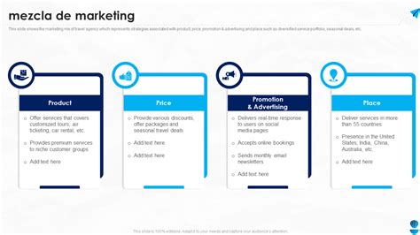 | Promoción | Publicidad, relaciones públicas, marketing digital, ventas personales | Anuncios en redes sociales, comunicados de prensa, email marketing, equipo de ventas capacitado |