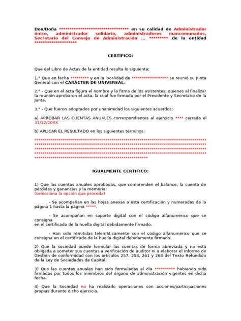 El Modelo 1 de Certificación de la Junta Universal es un documento esencial para las Pequeñas y Medianas Empresas (PYMES) en España, utilizado para certificar la aprobación de las cuentas anuales en una Junta General Universal. Este modelo asegura que las cuentas han sido aprobadas por unanimidad por todos los socios, facilitando su depósito en el Registro Mercantil.