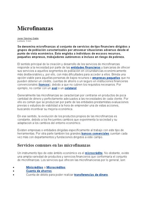 Las microfinanzas son el conjunto de servicios financieros, como créditos y préstamos, destinados a personas con bajos ingresos que, por lo habitual, no tienen acceso a servicios bancarios tradicionales.