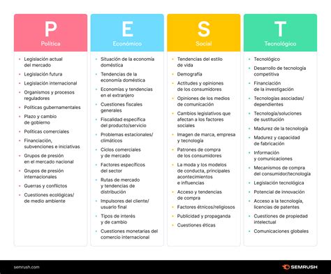 En situaciones particulares, como las nuevas empresas o las ideas de lanzamiento de productos, estos factores deben analizarse cuidadosamente para determinar la magnitud de su papel en el éxito de la organización. Un análisis PESTEL (antes conocido como análisis PEST) es un marco o herramienta que se utiliza para analizar y supervisar los factores del macroentorno que pueden tener un profundo impacto en los resultados de una organización. Esta herramienta es especialmente útil cuando se inicia un nuevo negocio o se entra en un mercado extranjero.