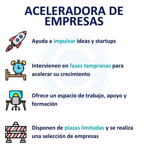 - Aceleradoras: El propósito de una aceleradora es acelerar el crecimiento de startups ya establecidas. Esto significa que ofrecen asesoría experta a empresas de reciente creación que ya han planificado su operatividad. Así, los mentores pueden ir directamente a impulsar su crecimiento. Su objetivo es "acelerar" el crecimiento de la startup, ayudándola a lograr rentabilidad en un corto período de tiempo. Las aceleradoras ofrecen mentorías y recursos más especializados para optimizar procesos y estrategias, enfocados en alcanzar las tasas de crecimiento previstas para asegurar la supervivencia de la empresa en sus primeros años.
