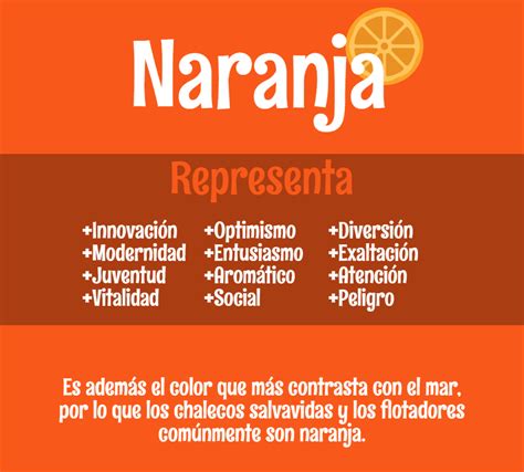 El naranja aporta espíritu de independencia y confianza en uno mismo, es el color de la energía constructiva y de la creatividad. Dicen de él que provoca ganas de comer y diversos estudios han demostrado que se asocia con el sabor dulce.