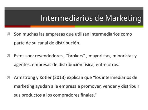 - Los intermediarios ayudan a una empresa a promocionar, vender y distribuir sus productos a sus clientes.