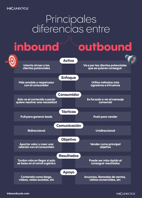 El outbound marketing es más activo, lo que significa que vas tras los clientes potenciales que quieres, mientras que el inbound marketing es más pasivo, lo que significa que te centras más en la generación de clientes potenciales y en esperar a que los clientes acudan a ti.