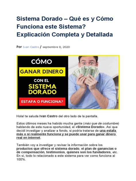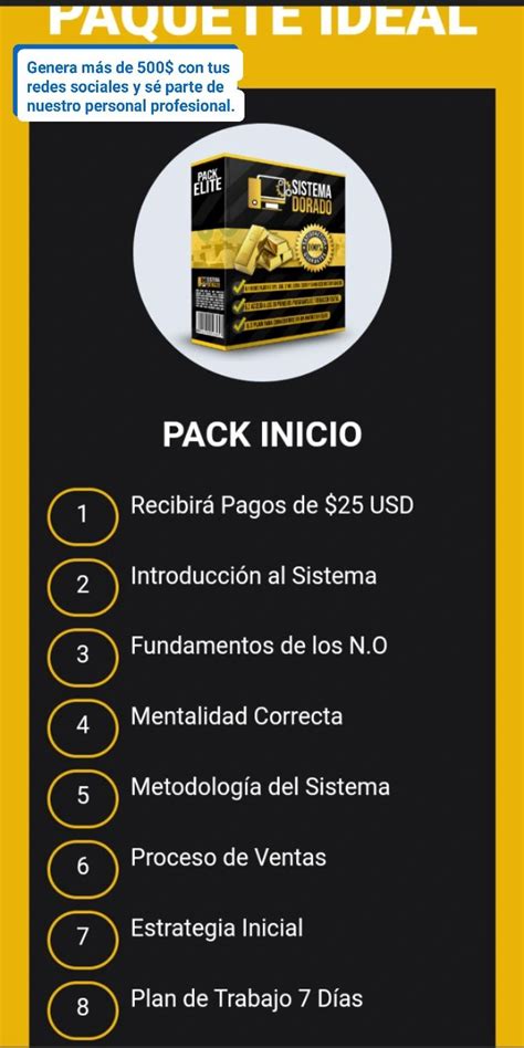 El Sistema Dorado es una plataforma educativa tipo franquicia digital que te enseña a cómo vender en Internet productos digitales y donde le permitirá obtener el 100% de comisiones de todos nuestros packs educativos ($25, $50, $100, $200, $500, $1000 Dólares). Es "El Único Sistema en el Mundo para Lanzar y Construir un Negocio de 6 Cifras en Tiempos de Crisis y Trabajando desde Casa".