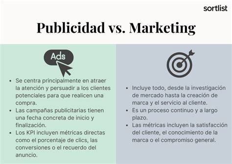 - Enfoque comercial: el marketing normalmente persigue llevar la mirada a la misión de la compañía y la publicidad, a aspectos concretos de su visión.
