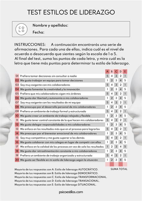 Un test de estilos de liderazgo es una herramienta diseñada para evaluar las características y comportamientos de un líder en diferentes contextos. A través de preguntas de opción múltiple, los participantes pueden identificar su estilo de liderazgo predominante y cómo este influye en su interacción con los demás. Una vez que completes el test, recibirás un perfil que describe tu estilo de liderazgo, ya sea autoritario, democrático, transformacional, entre otros.