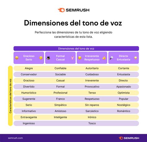 La siguiente tabla resume los aspectos clave para definir el tono de comunicación de tu marca: