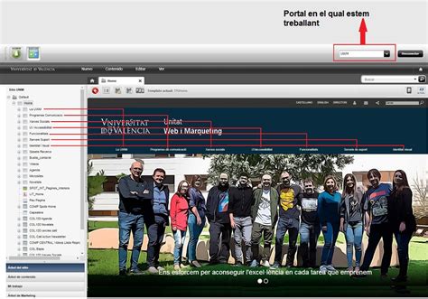 Lo primero que hay que tener presente es en qué portales web estamos dados de alta como editor/a, dado que en la mayoría de los casos cada responsable de la edición tiene acceso a más de un portal. Es común que una persona responsable de la edición web de un centro de la UV sea a la vez editor/a de los portales de departamentos o de las titulaciones adscritas al centro. En estos casos la persona que tiene que editar un portal web en concreto se tiene que asegurar de que está trabajando en ese portal.