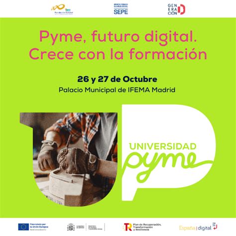 Te invitamos a que asistas a Universidad Pyme, un evento único en el que podrás conocer multitud de experiencias e iniciativas innovadoras que las instituciones y las empresas están llevando a cabo para impulsar la transformación digital, que tendrá lugar en el Palacio Municipal de IFEMA Madrid los próximos días 26 y 27 de octubre, bajo el lema: "Pyme, futuro digital. Crece con la formación".