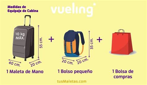 Durante el proceso de reserva, tienes la opción de comprar una segunda maleta de mano más grande por una tarifa de 24 eur a 59 eur dependiendo de la ruta y la distancia. La compañía low cost Vueling permite llevar gratis un solo equipaje de mano de 55 x 40 x 20 cm y 10 kg de peso.