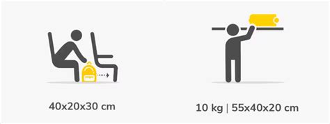 - Maleta de mano: Debe tener un peso máximo de 10 kg y unas dimensiones que no excedan los 55 × 40 × 20 cm.